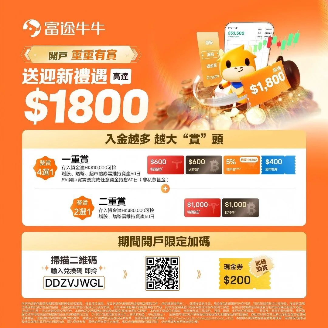 即日起至12月31日,下載富圖牛牛APP,開戶前輸入兌換碼【DDZVJWGL】,再存入港幣一萬元,無須交易即送高達$1,800迎新優惠 !包括HK$200超市禮券及港股證券買賣一世免佣 !